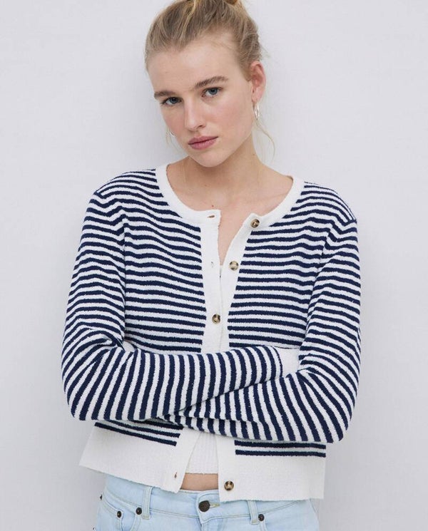 Striped cardigan. Cotton and recycled fiber blend. Straight cut. Round neck. Long sleeves. Tortoiseshell button closure. Contrast color trim. Two buttoned patch pockets at the front.