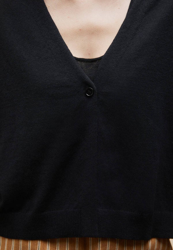 Fine knit cropped cardigan. Short sleeves and V-neck. Ribbed trim.