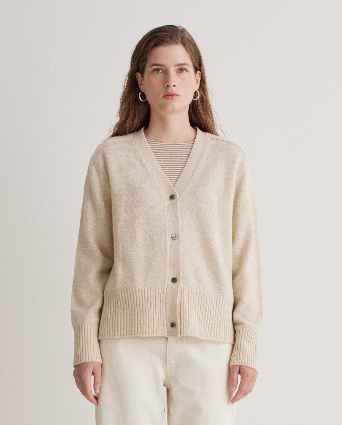 Cardigan made of RWS wool and recycled fibres. Regular fit. V-neck. Long sleeves. Mother-of-pearl buttons in front. Side slits at the hem. Ribbed accents.