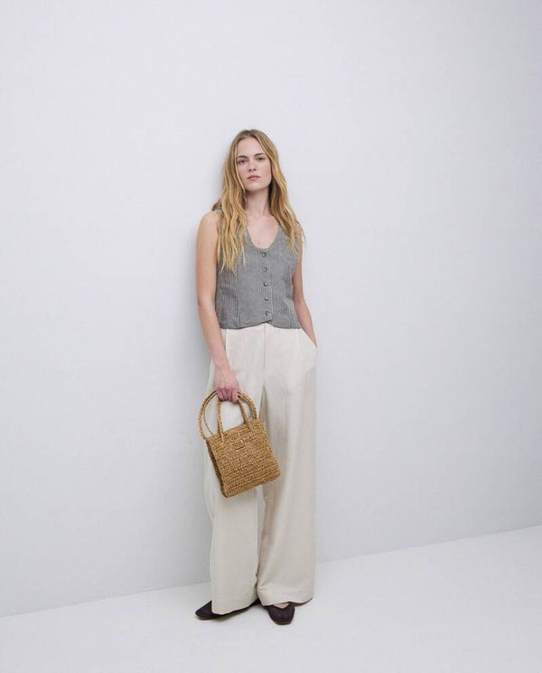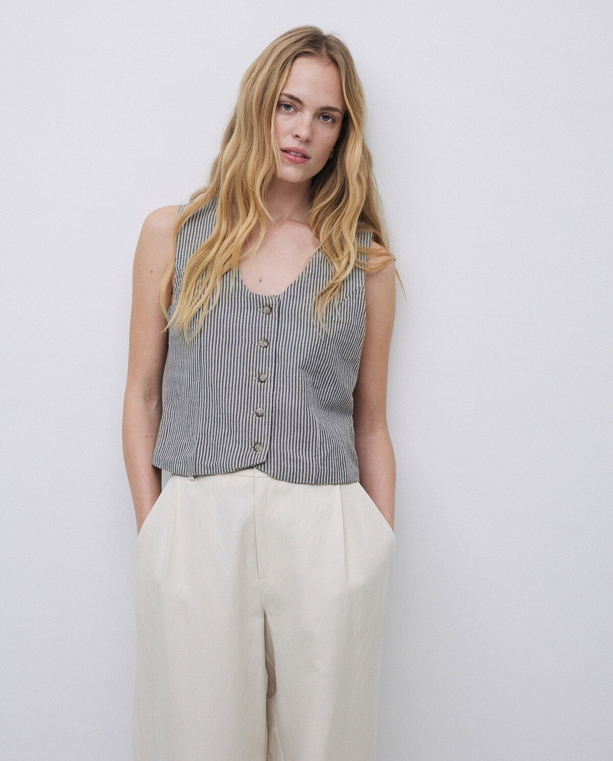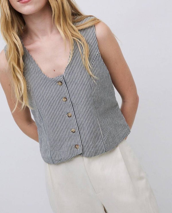 Linen and cotton blend vest . Striped print. Straight cut. Round neckline. Sleeveless. Tortoiseshell button closure. Adjustable straps with buckle at the back.