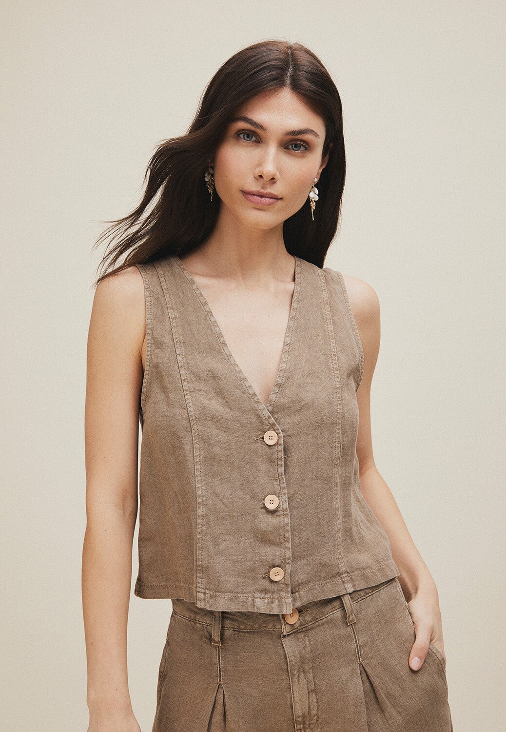 100% linen vest. V-neckline and four-button front closure. Adjustable back strap and buckle.