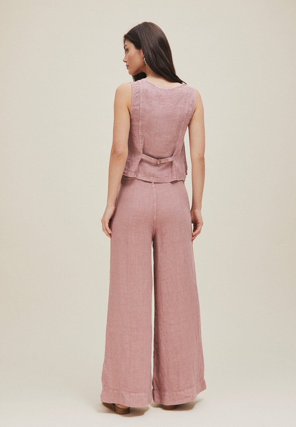 100% linen vest. V-neckline and four-button front closure. Adjustable back strap and buckle.