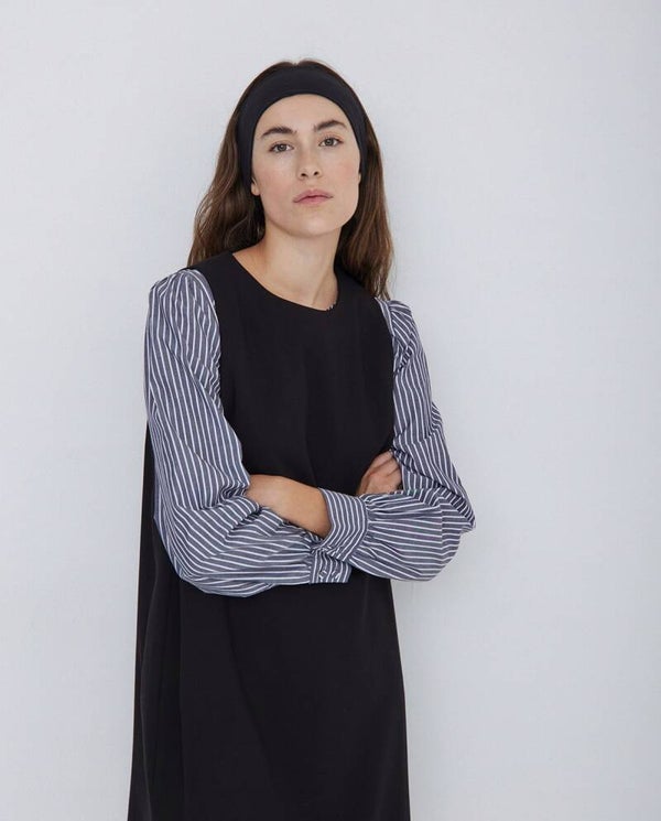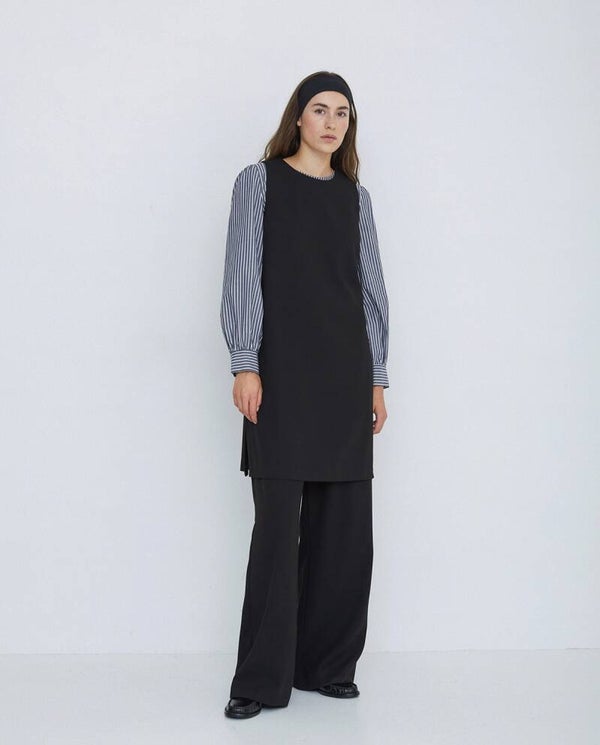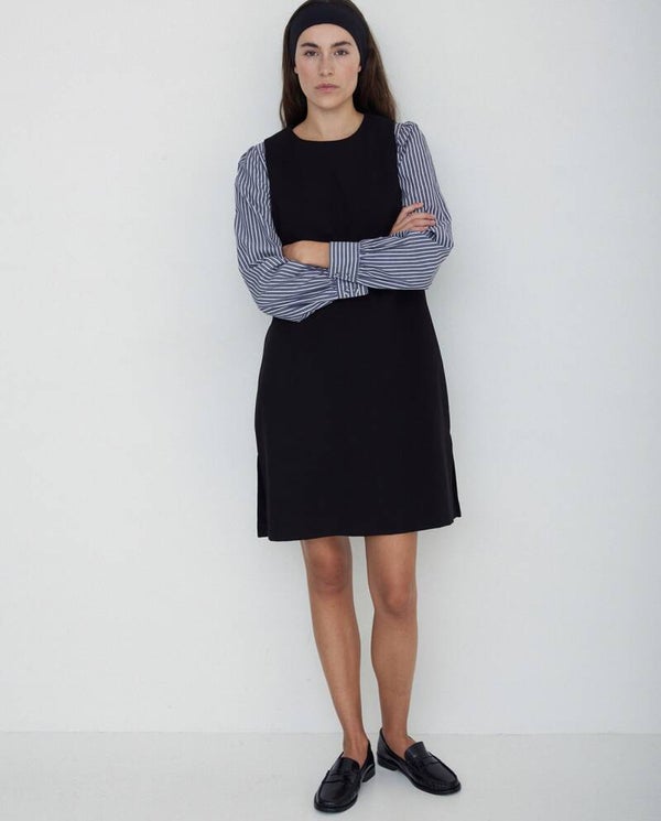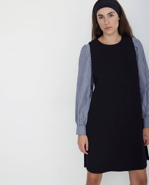 Tailored dress. Pencil skirt. Round neckline. Sleeveless. Zip close in back.