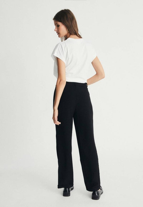 Trousers with crepe pleats. Model with flat waistband and 6 belt loops. Two pockets inserted in the side seam.