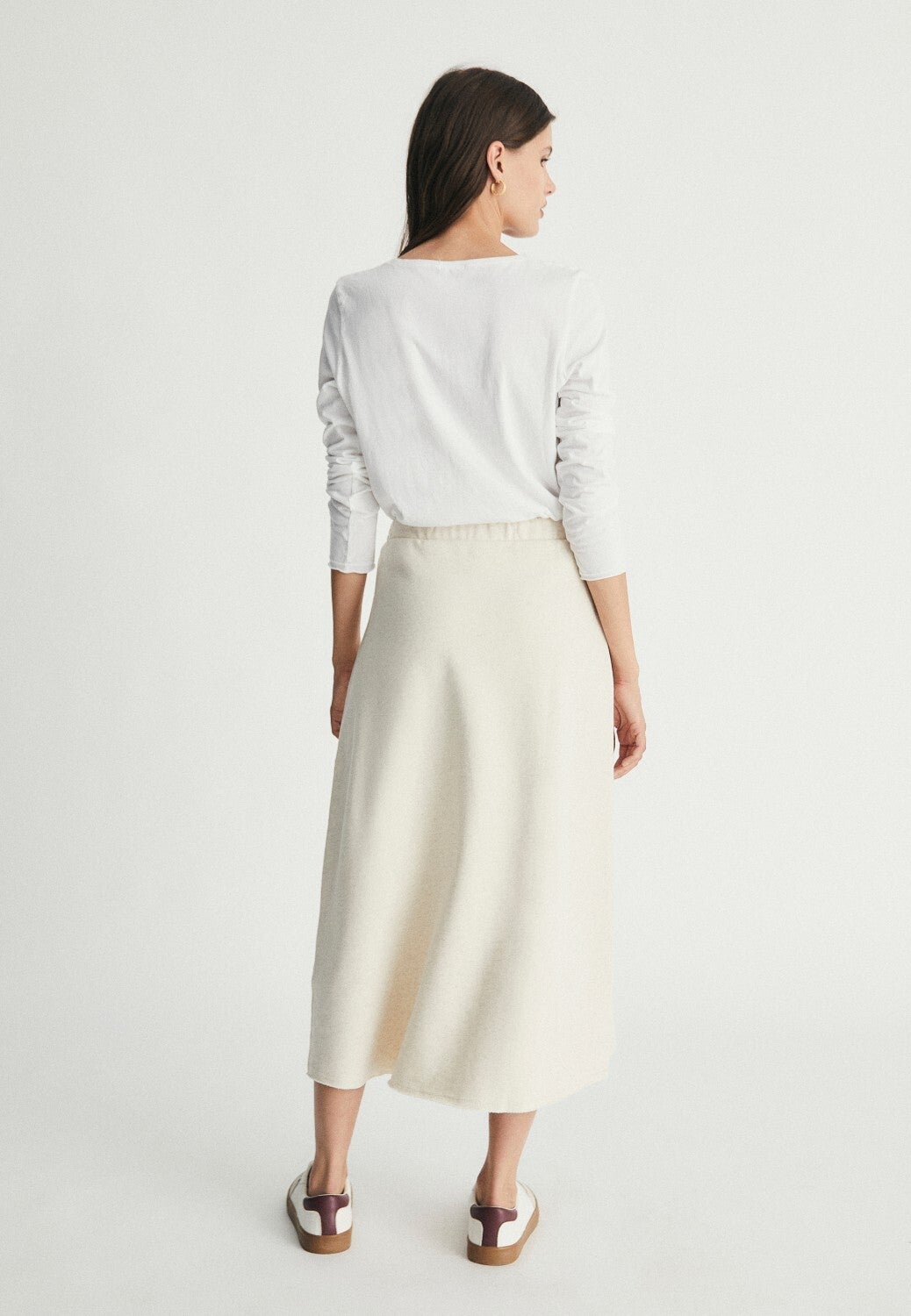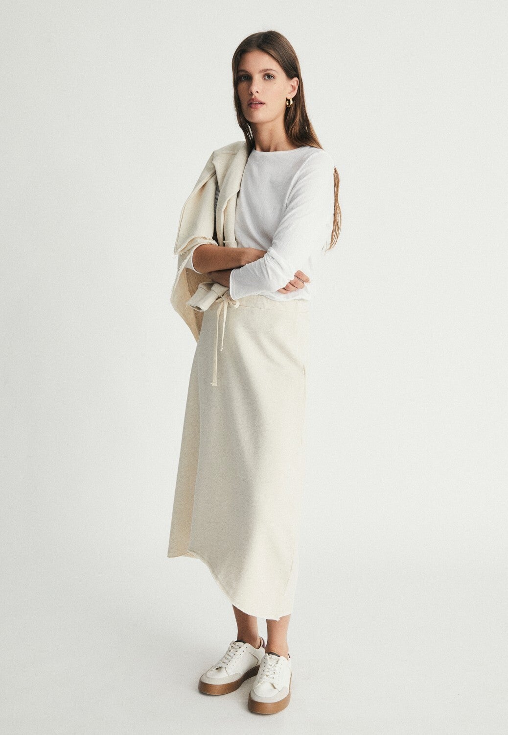Long asymmetric skirt, printed with a motif representative of the collection. Model with flat waistband adjustable with drawstrings.