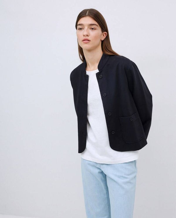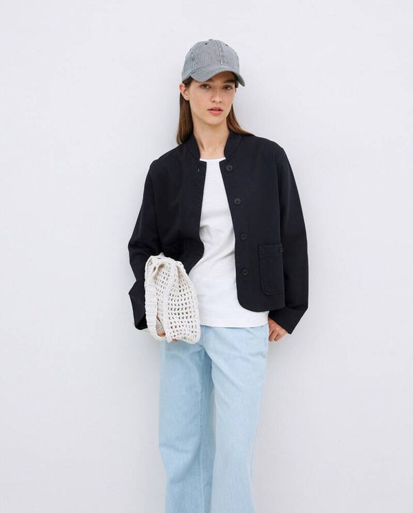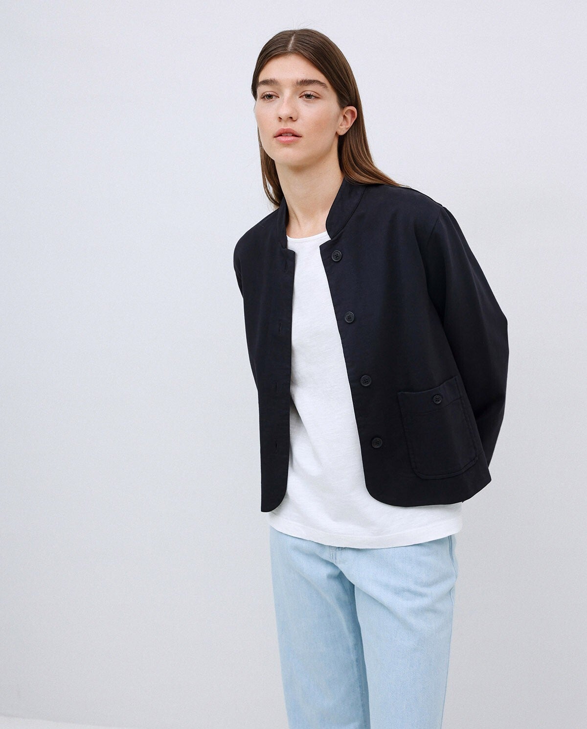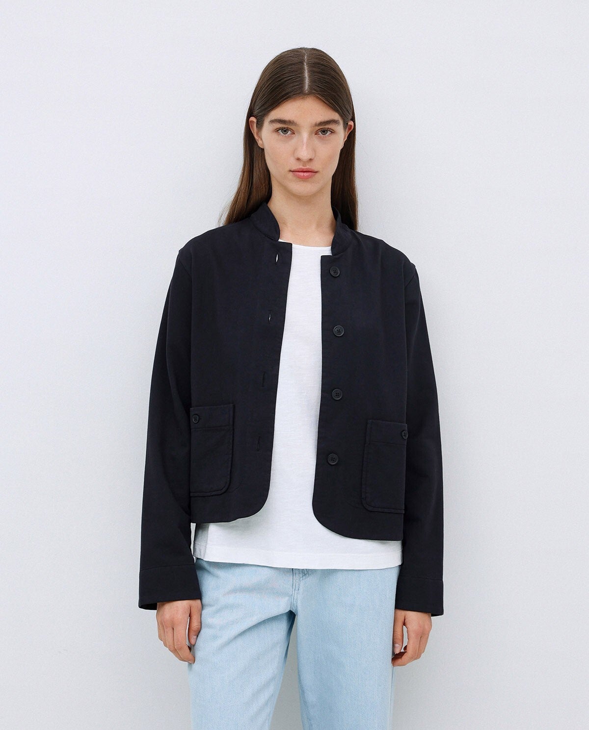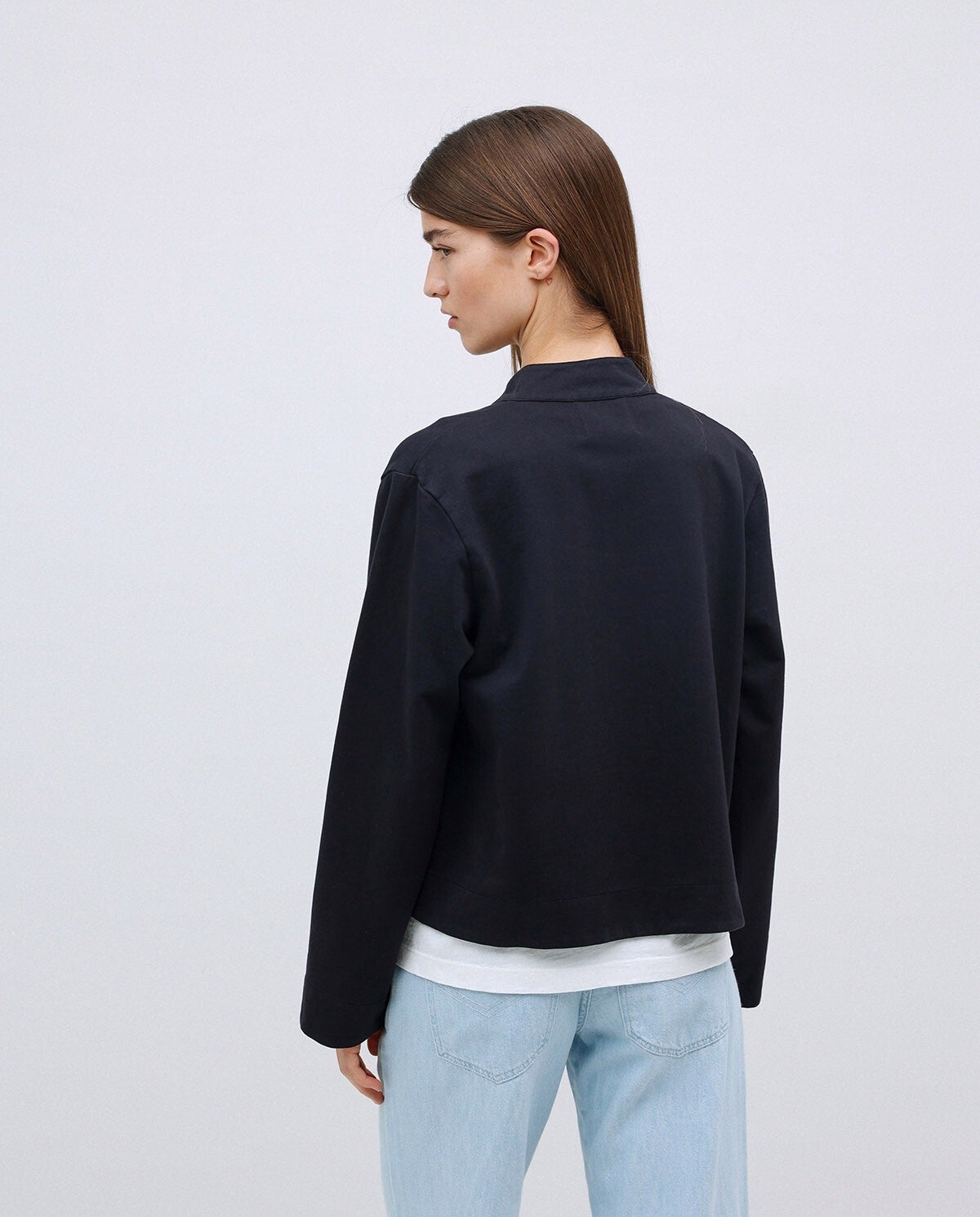 Short jacket. 100% cotton fleece fabric. Straight cut. Mao neck. Long sleeves. Neck lining. Button close. Front patch pockets with button fastening.