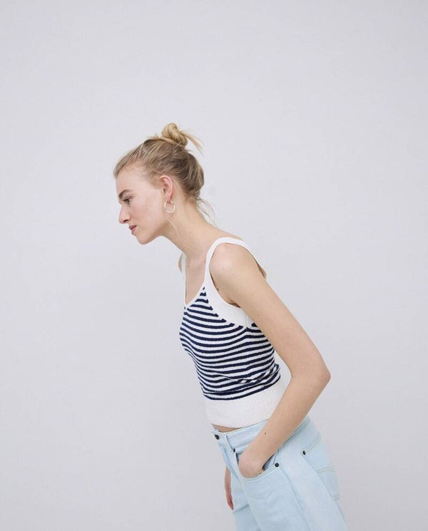 Strappy top. Striped print. Cotton and recycled fiber blend . V-neck. Sleeveless. With straps. Ribbed hem.