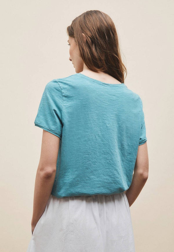 Flamed cotton T-shirt. Short-sleeved, round-neck design.
