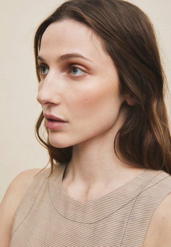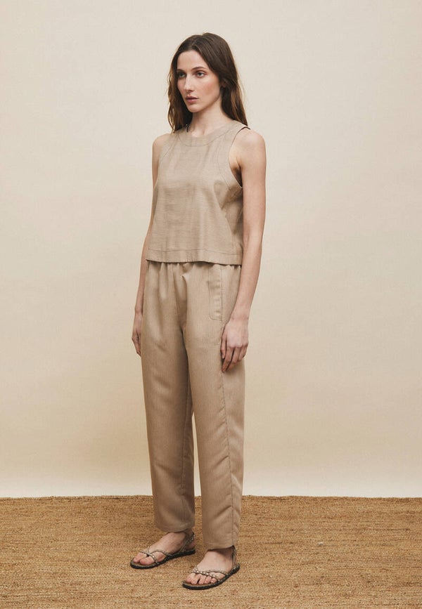 Striped top. Sleeveless, with wide straps and a round neckline. Buttoned back and navy blue topstitching.