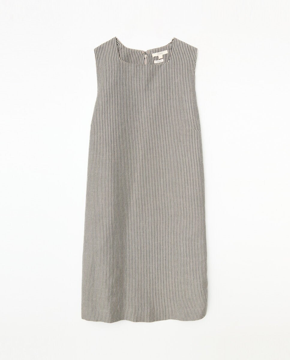 Short dress. European Flax linen and cotton blend . Striped print. Sleeveless. Zip and hook closure at the back. Two side pockets.