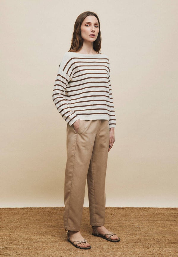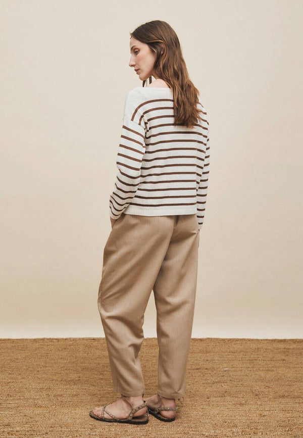 Long striped pants. Balloon style, elasticated waistband, and inset pockets in the side seams.
