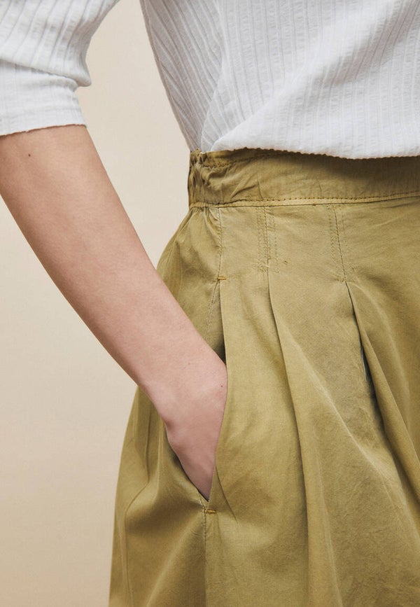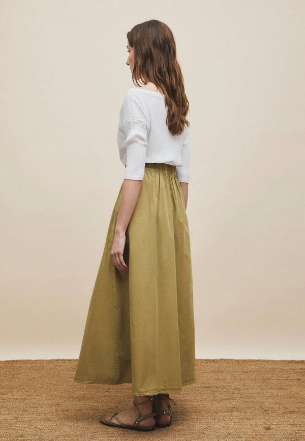 Long poplin skirt. Darted design, flat front waistband, elasticated back. Inset pockets in side seams.