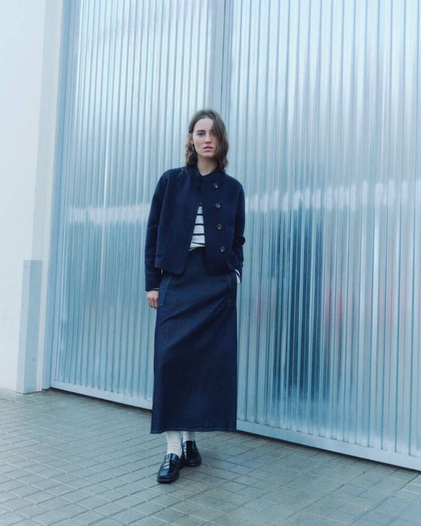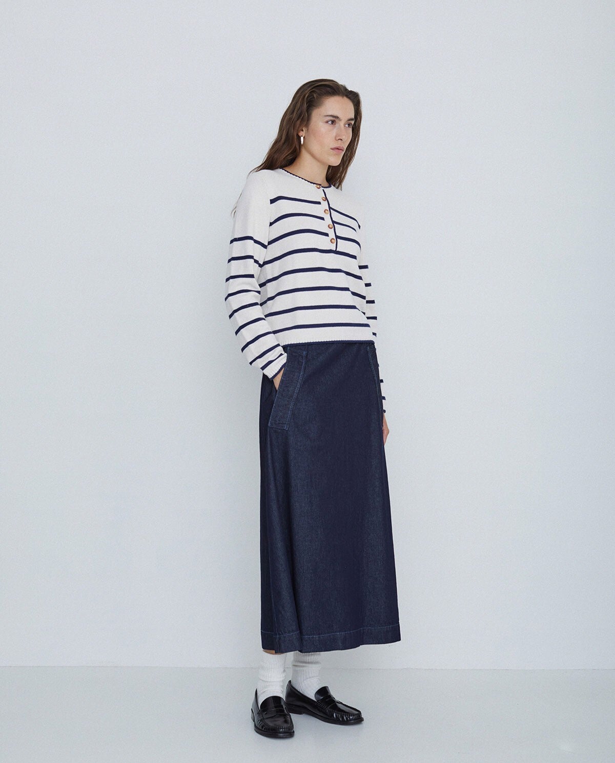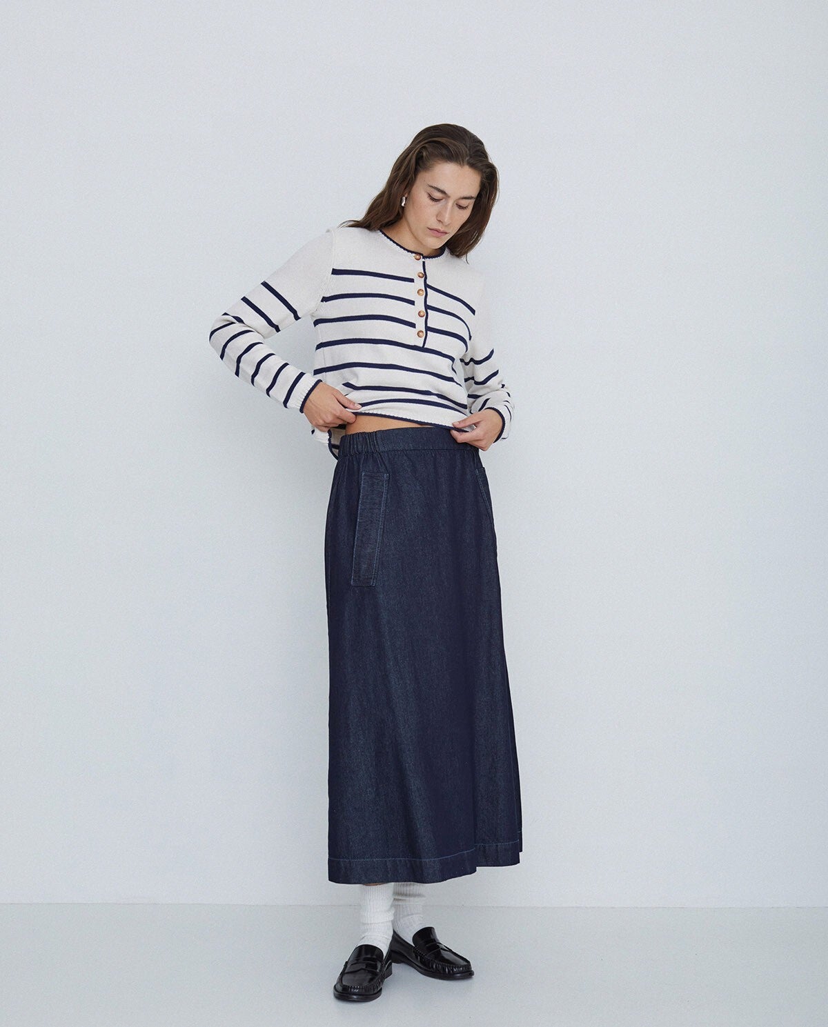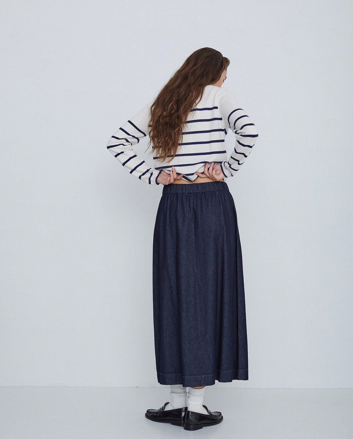 Maxi-skirt. Denim. Flared cut. Elastic waist in back. Side pockets. Unlined.