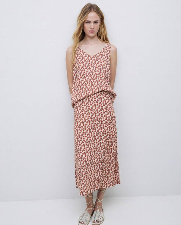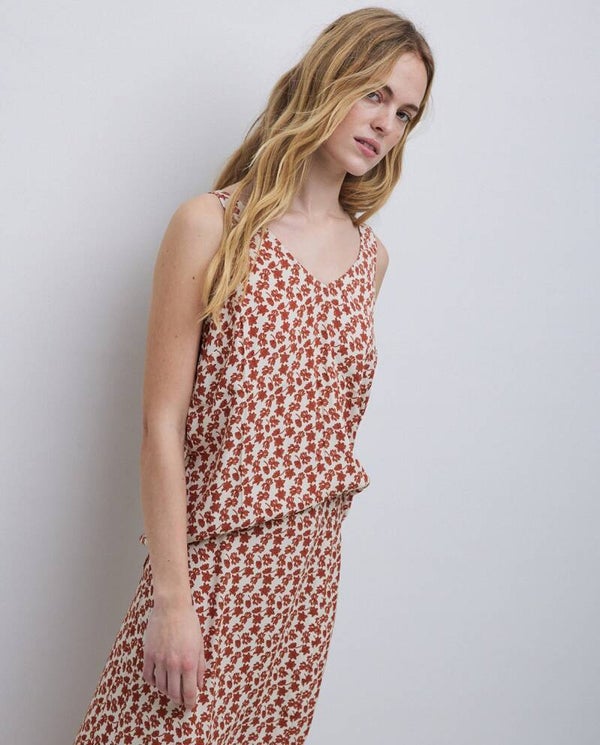 Camisole top. Ecovero viscose fabric. Geometric print. V-neck at the front and back. Sleeveless.