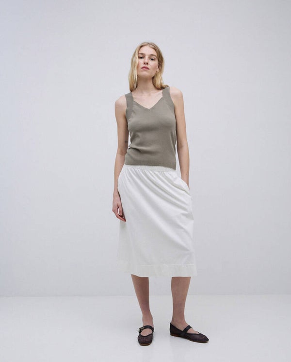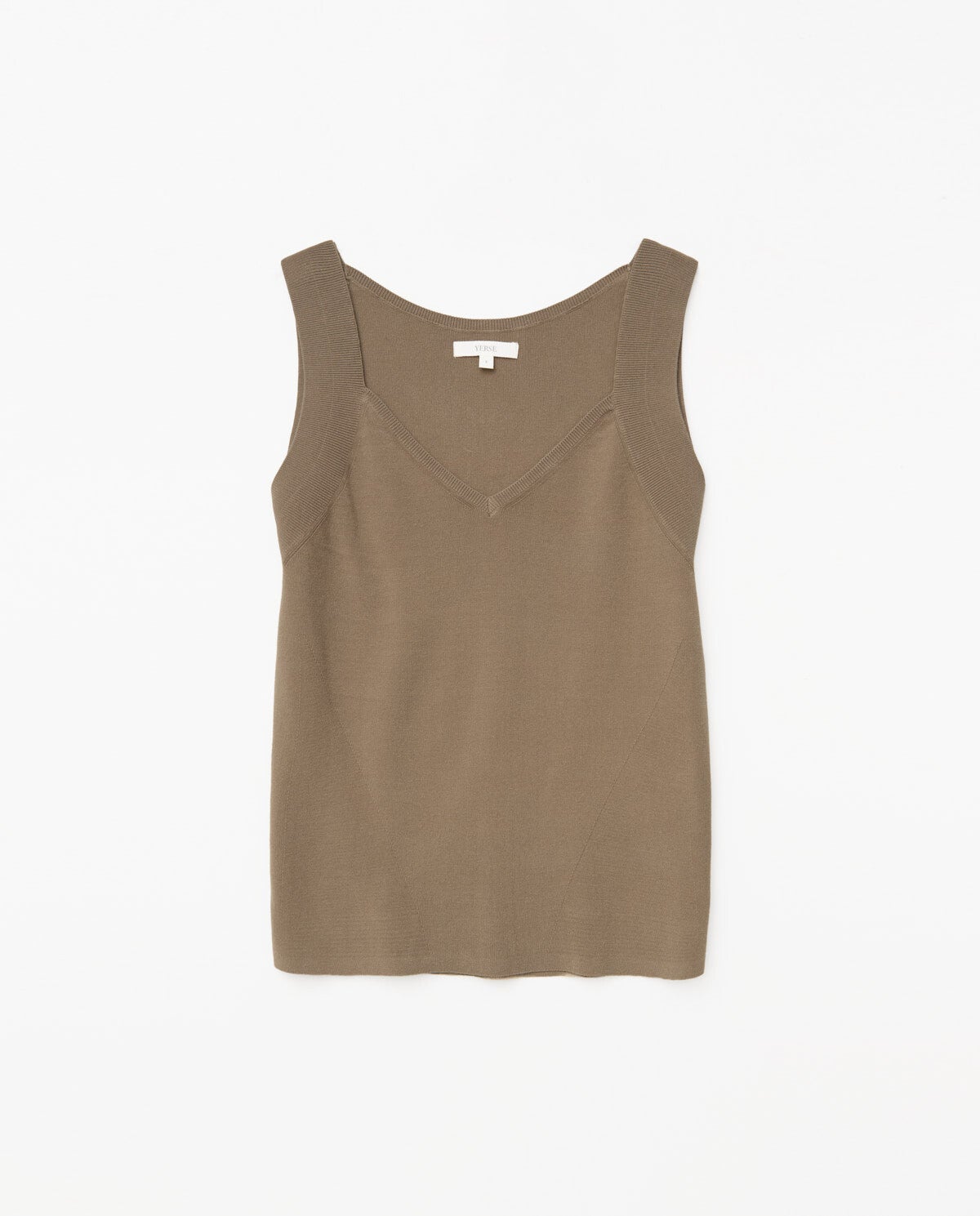 Wide-strap top. Viscose blend fabric. Straight cut. V-neck. Ribbed accents.