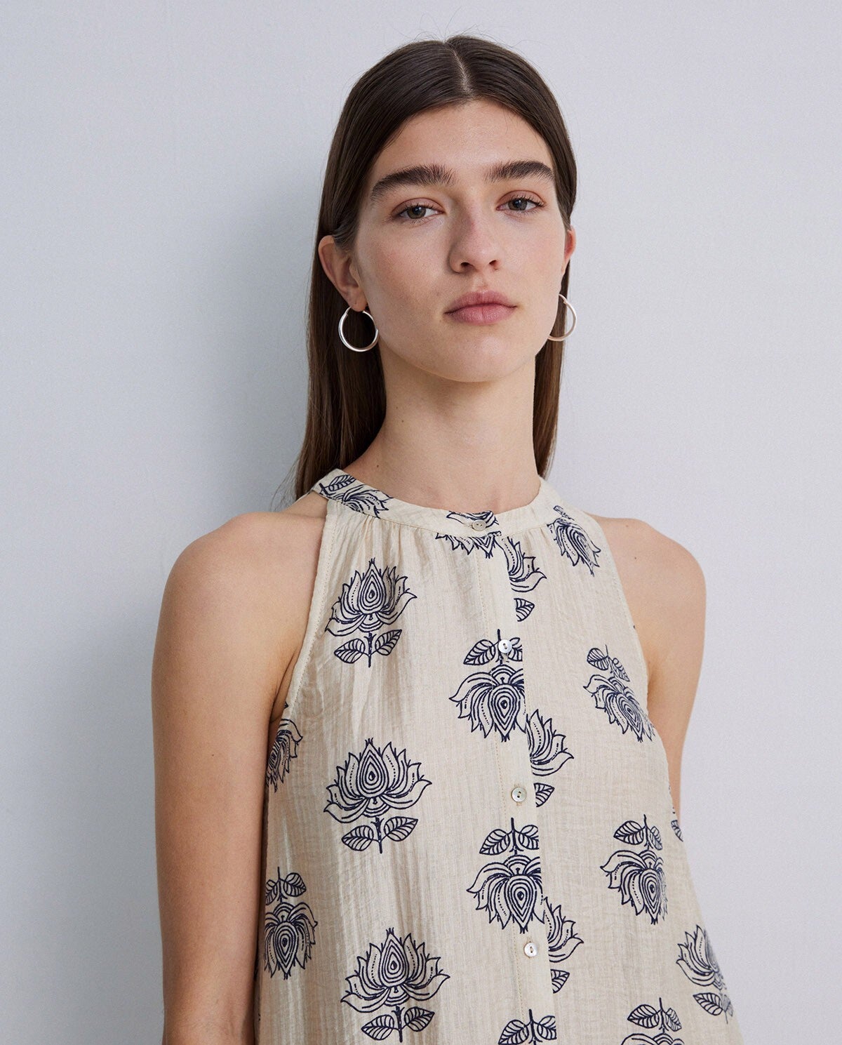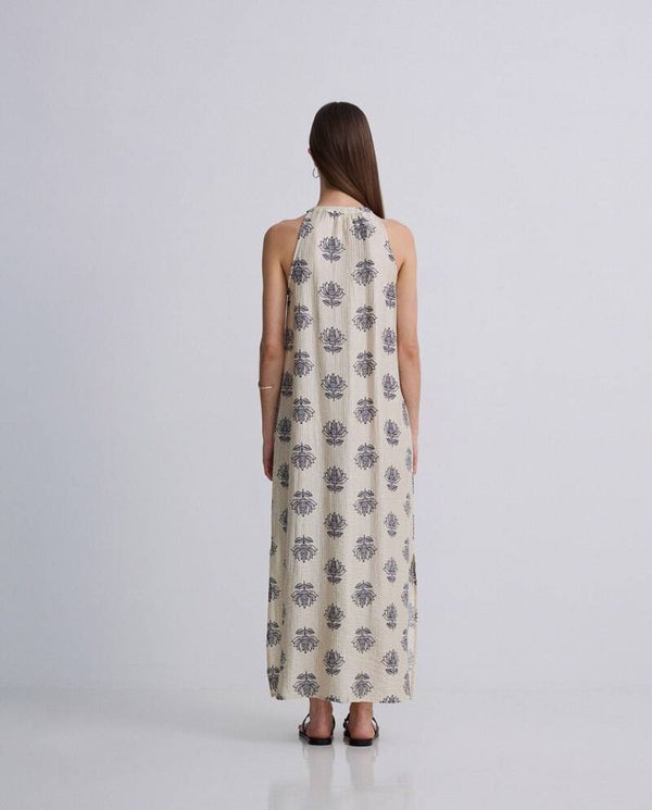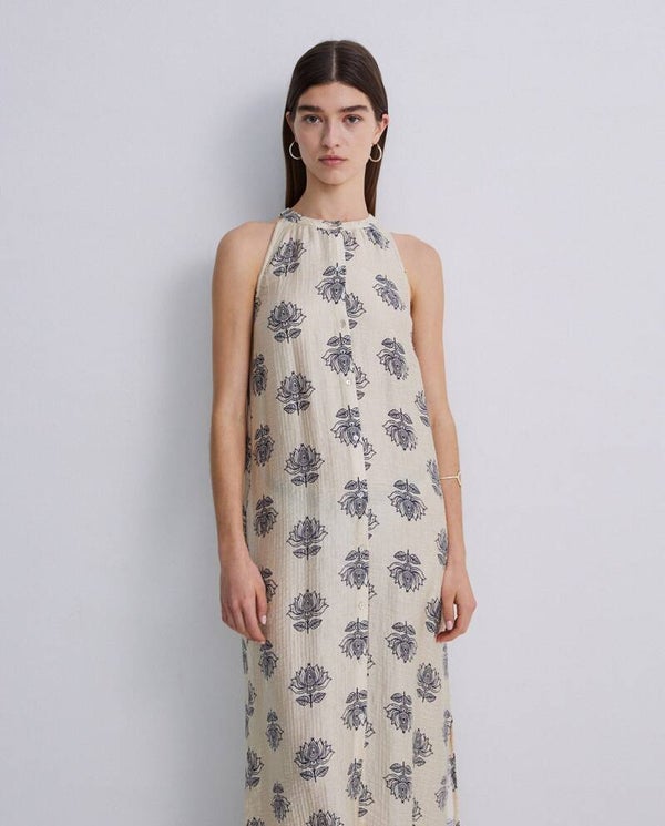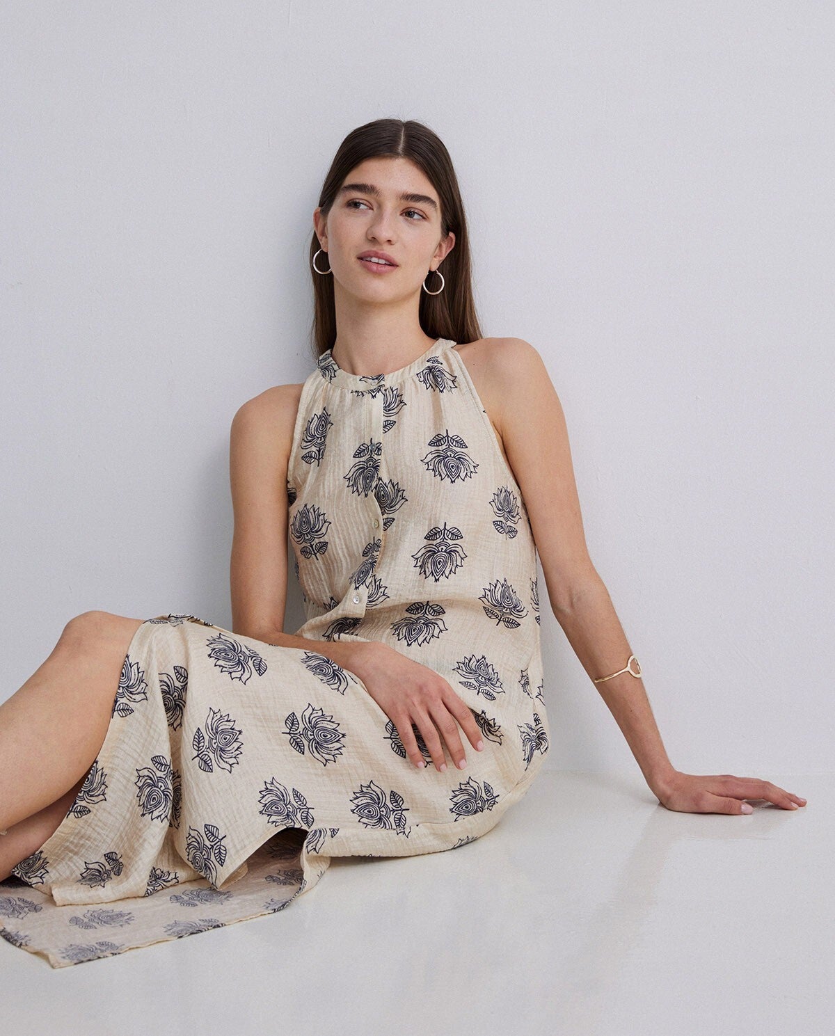 Midi dress. Wrinkle effect. Viscose and lyocell blend. Halter neck. Sleeveless. Button fastening in front. 2 side pockets. Side slits at the hem.