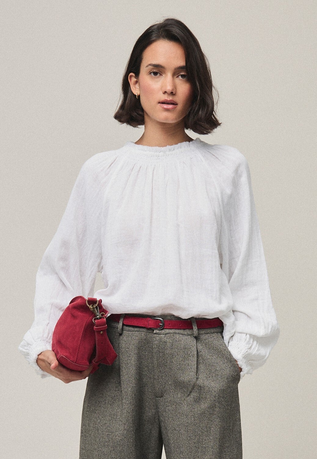 Mao collar blouse with a small ruffle, center button placket with mother-of-pearl buttons, and a double ruffle detail. Long sleeves with gathered cuffs for added volume. Gathered seams on both the front and back add volume.