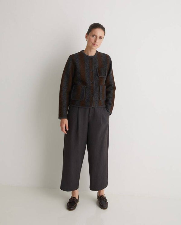 Short regular-fit jacket. Made of boiled wool. Striped print. Round neckline. Long sleeves. Button front. Contrasting accents. Two front patch pockets and 1 chest pocket.
