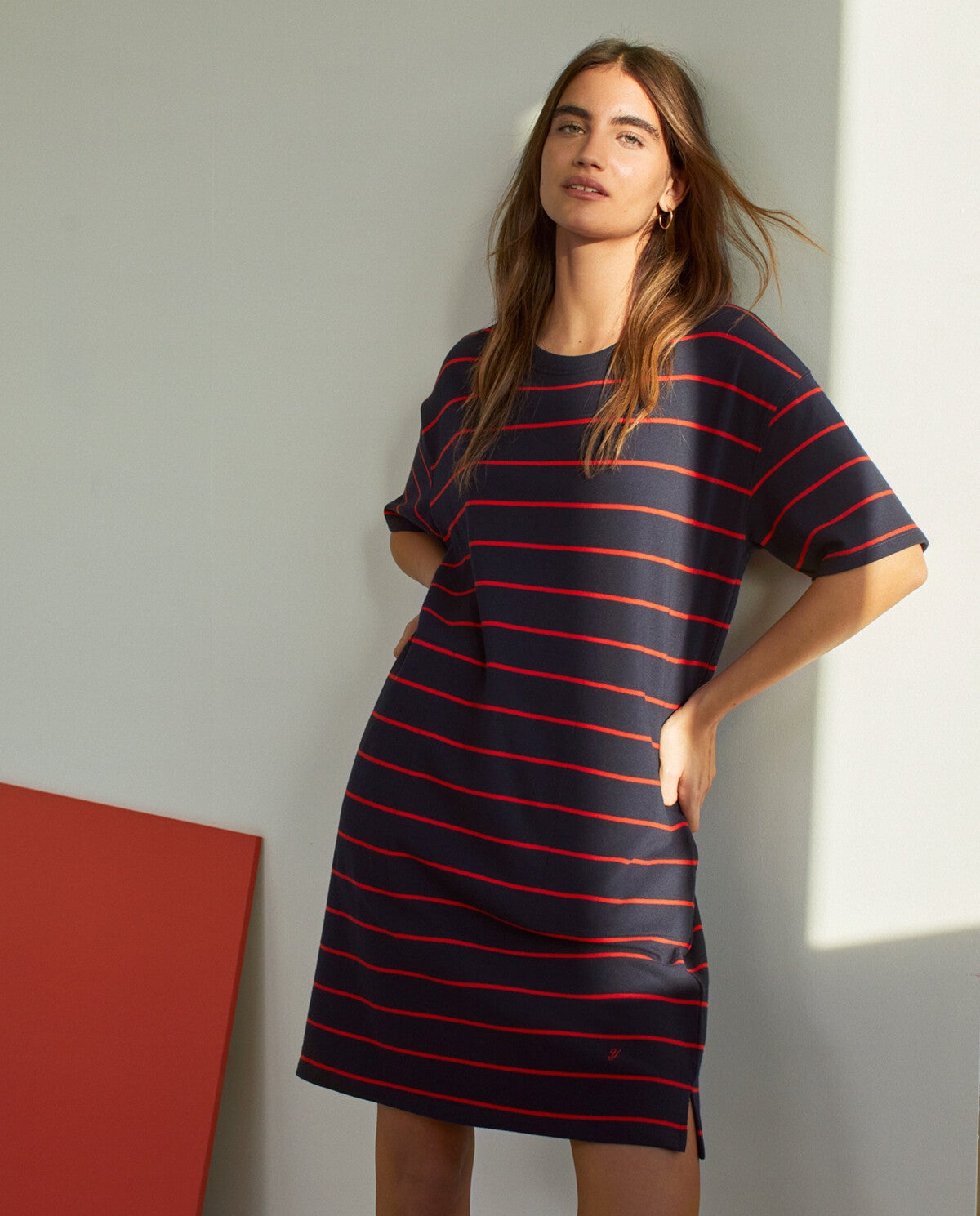 Short-sleeve short dress with round-neck. Cotton fabric.